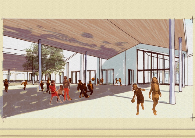 L’école élémentaire est restructurée, préservant sa morphologie, sa logique de parcours clairs, l’alternance de pleins, de vides, de jardins en creux. Les 8 classes en extension sont réalisées autour d’un patio central, en bouclant la circulation originale.
